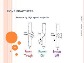 Glass Fracture Patterns by Anya b. - Prezi Glass Fracture Patterns Fracture Patterns A special type of glass made by substituting metal oxides for silica Used in car head lights, glasses used in labs, and thermometers by: Anya Byrd Order of Penetration It's relatively easy to find out the order in which the glass was fractured. You look at the radial fractures.