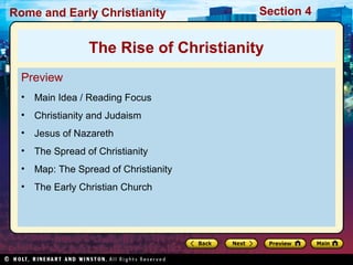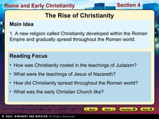 PDF The Rise of Christianity - Springfield Public Schools The Life and Teachings of Jesus Roman power spread to Judea, the home of the Jews, around 63 B. C.At first the Jewish kingdom remained independent, at least in name. Rome then took control of the Jewish kingdom in A. D.6 and made it a province of the empire. A number of Jews, however, believed that they would once again be free.
