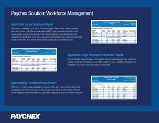 PDF Determine your Full-Time Equivalent Employees under PPACA the shared responsibility provisions of the patient protection and affordable care act ("ppaca") provide that "applicable large employers" with 50 or more "full-time" (including full-time... APPENDIX A Applicable Large Employer 'ALE' Worksheet ... Applicable Large Employer 'ALE' Worksheet Instructions The ALE Worksheet provides a tool with which to determine and document your ACA reporting status. It is easy to use and requires you to perform some basic calculations as described below. PDF Sage 100 Payroll Report Samples ACA Applicable Large Employer Report Period End Dates: 1/1/2017 to 12/31/2017 Dec Hours Nov Hours Oct Hours Sep Hours Aug Hours Jul Hours Jun Hours May Hours Apr Hours Mar Hours Jan Name Hours Employee Number Feb Hours 00-0000001 Demotts, Lady A. 177 160 177 171 177 171 177 177 171 74 0 0 00-0000002 Bullock, Adrienne G. 177 160 177 171 177 171 ... Applicable Large Employer - HUB International What is an Applicable Large Employer (“ALE”)?. The Affordable Care Act (“ACA”) employer mandate to offer compliant health insurance applies to an employer that ...12 pages