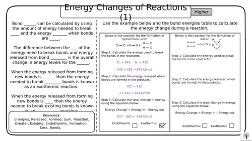 Energy And Chemical Reactions Worksheet Answers Feb 23, 2022 · Energy in = 2 × 366 = 732 kJ mol-1 Energy out = 436 193 = 629 kJ mol-1 Energy change = in – out = 732 – 629 = 103 kJ mol-1 The activity change is positive. This shows that the acknowledgment is endothermic. Hydrogen reacts with oxygen to anatomy water: 2 × (H−H) O=O → 2 × (H-O-H)