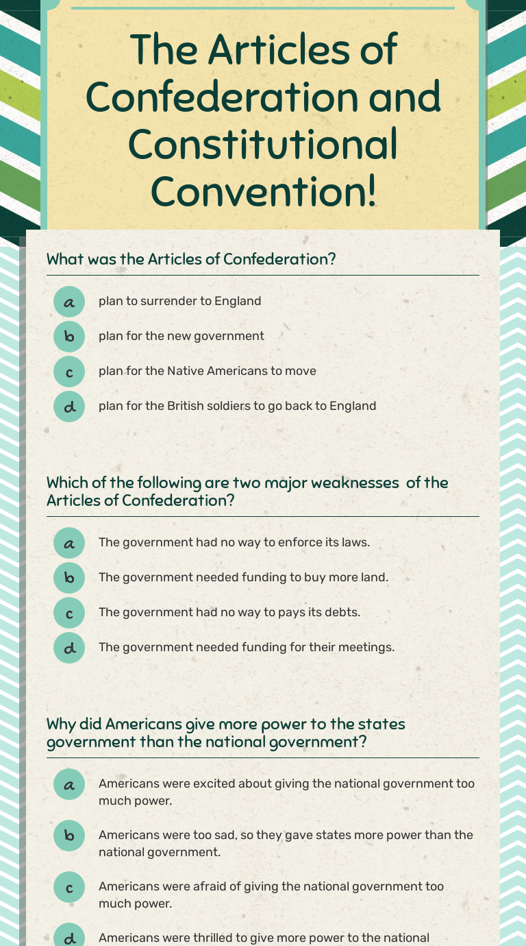 The constitutional convention worksheet. What are your rights and responsibilities as an American ... Sep 10, 2021 · I ask that you support the Convention of States Project and consider becoming a co-sponsor of the resolution. Please respond to my request by informing the national COS team of your position, or sending them any questions you may have: info@conventionofstates.com or (540) 441-7227. Thank you so much for your service to the people of our district. The Constitutional Convention (article) | Khan Academy The Constitutional Convention. The Constitutional Convention. This is the currently selected item. The US Constitution. The Federalist Papers. The Bill of Rights. The Constitution | iCivics In 1787, delegates to the Constitutional Convention decided that it was time for a change. A new plan for government was outlined in the Constitution, and it was George Washington's job to present this document to Congress. As with any important document, the Constitution was delivered with a letter of introduction. Classroom Resource Library | The National Constitution Center Students will examine the ideas that the Founding Fathers brought to the Constitutional Convention of 1787, and use them to analyze the Constitution and Bill of Rights. Lesson Plans The History of Flag Day