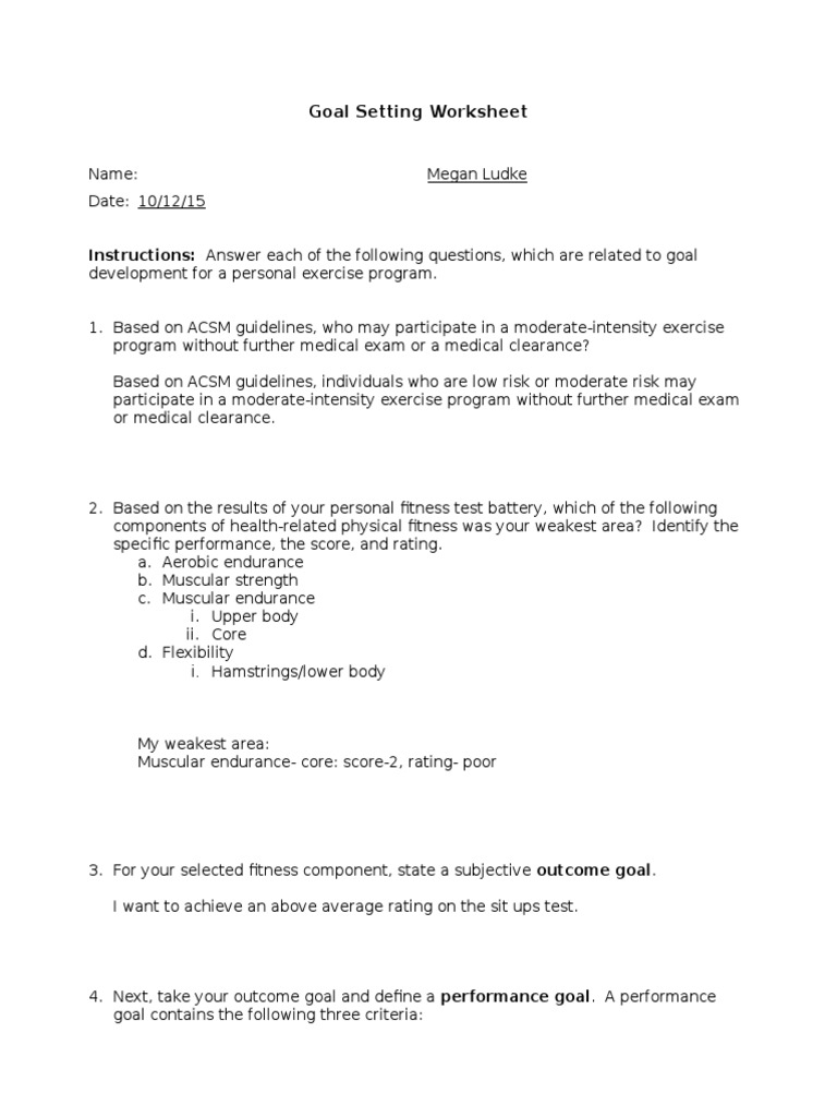 Smart Goals Fitness Worksheet Examples Review - share.real.com Smart Goals Fitness Worksheet Examples. The following are 20 personal smart goals examples that you can set to improve your life. Make sure your nutrition goals are smart! ... These goals are s pecific, m easurable, a.This goal setting worksheet has space for 3 goals, which is the most goals you really want to be actively working on at any ...