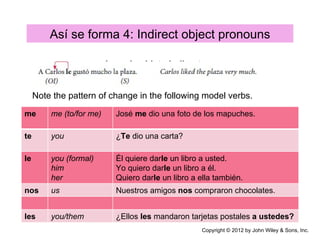 Learn Spanish online free beginners Más arriba Más arriba is an interactive workbook of introductory Spanish language exercises, based on the pictorial contextualization of fundamental vocabulary and language points. The exercise material includes images, sound, feedback and vocabulary help. Direct and Indirect Object Pronouns in Spanish | SpanishDict Notice that when object pronouns are attached to a verb, it's often necessary to add an accent in order to preserve the natural stress of the verb. Changing Le to Se The indirect object pronouns le and les change to se when followed by the direct object pronouns lo, la, los and las . Spanish: Direct, Indirect, and Reflexive Pronouns - Document Title This worksheet is to be used in conjunction with “Mosaicos” and “Fuentes” ... In the case of compound verb forms, the direct object pronoun may go either ... Direct and indirect objects in Spanish | Free exercises | - Say Zonte! Oct 20, 2020 ... It's essential to know the direct and indirect Spanish object pronouns in Spanish. To use them correctly, you need to decide between the ...