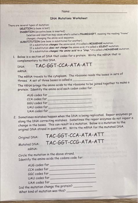 Mutations Worksheet.docx - Mutations Worksheet - Deletion, Insertion ... Classify each as Deletion, Insertion or SubstitutionANDas eitherframeshift, missense, silent or nonsense (Hint: Deletion & Insertion will always be frameshift). Original DNA Sequence:TACACCTTGGCGACGACT…mRNA Sequence:Amino Acid Sequence:Mutated DNASequence #1TACATCTTGGCGACGACT… What's themRNAsequence?