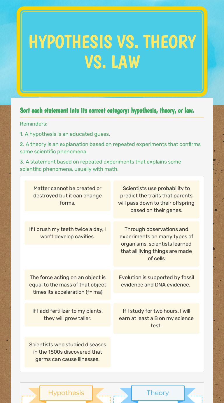 Theory And Law Teaching Resources | Teachers Pay Teachers PDF This Scientific Theories and Laws Group Activity is a fun activity to get students thinking about how scientific discovery utilizes various pieces of information almost like working on a puzzle. The "puzzle pieces" are used to develop testable hypotheses and from there, scientific theories! Theory vs law worksheet.docx - Name: Period: Discovering... The common use of the term "theory" means the same thing as "Scientific Theory." True or (False) 3. Scientific Laws and Scientific Theories are the same. True or (False) 4. A Scientific Theory can become a Scientific Law. True or (False) 5. A Scientific Law can become a Scientific Theory. True or (False) 6. Theory and Law worksheet - Liveworksheets.com More Vocabulary interactive worksheets. Human development. by CrisElizabeth. Physical and Chemical Changes-Properties-1. by ProfesorCorrales. Can and wild animals. by Carolinalopezm. Universe. by LIZBETHBASANTES.