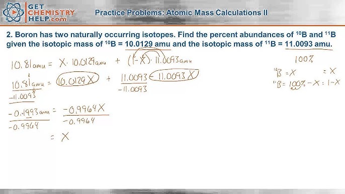 How To Calculate The Average Atomic Mass - YouTube Sep 9, 2018 ... This chemistry video tutorial explains how to calculate the average atomic mass of an element given the percent abundance of each isotope. Calculating Average Atomic Mass Worksheet The term "average atomic mass" is a average, and so is calculated differently from a "normal" average. Show ALL calculation setups (worth 6/10points on the ... Calculating Average Atomic Mass Worksheet - Name ___Lisa The element Copper has naturally occurring isotopes with mass numbers of 63 and 65. The relative abundance and atomic masses are: 69% for mass of 62 30% for ...