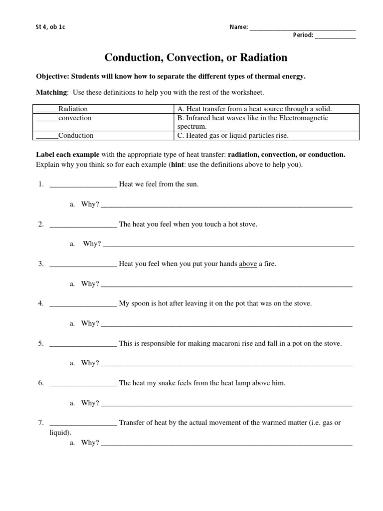 Heat Transfer Worksheet by All about Earth Science | TpT This worksheet provides examples of conduction, convection, and radiation and requires students to identify the type of heat transfer in each example. It makes an excellent homework assignment or 15 minute wrap-up after introducing students to heat transfer. 350156920 Methods of Heat Transfer Answers - Worksheet: Methods of Heat ... Worksheet: Methods of Heat Transfer (conduction, convection, and radiation) Define conduction: transfer of heat by direct contact between materials Define convection: transfer of heat by movement of large volumes of fluids moving to balance average KE (temperature)... hot rise, cool falls Define radiation: transfer of heat not requiring a medium to move it Identify the method of heat transfer ... Heat Transfer Worksheet Answers Fresh Heat Transfer Heat Transfer ... Description A great quiz to use to evaluate the students' understanding of the seven forms of energy and how the can transform from one to the other. This quiz gives a section at the end to allow the teacher to use physical displays for students to see (rather than pictures) and then explain the transformations that occur within those systems.
