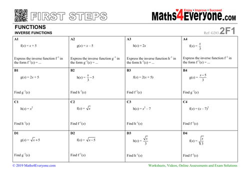 Inverses of functions worksheet. Inverse Functions - GCSE Maths - Steps, Examples & Worksheet Inverse functions examples Example 1: Finding the inverse of a linear function If f (x)=3x-7 f (x) = 3x − 7, find f^ {-1} (x). f −1(x). Write out the expression for the original function using a y y instead of the x x. Set this expression equal to x. x. 3y-7=x 3y −7 = x 2 Rearrange the equation to make y y the subject. Inverses of trigonometric functions Geometry Math Worksheets Free questions about "Inverses in trigonometric function" will help you improve your math knowledge and teach you thousands of math skills. Geometry students can use these worksheets to learn the best math skills. Categories Geometry, Math Post navigation. Law of Sines Geometry Math Worksheets. PDF Function Inverses Date Period - Kuta Software -2- Worksheet by Kuta Software LLC Find the inverse of each function. Then graph the function and its inverse. 11) f (x) x x y 12) f(x) x x y 13) g(x) x x y 14) g(n) n x y Critical thinking questions: 15) Give an example of a function that doesn't have an inverse. Inverse Functions Worksheets | Free Online Math Worksheet PDFs Inverse functions worksheets help the students to understand the concept in-depth and with more examples and practice problems. This will help them to be confident while taking their exams. Children can download the PDF format of these easily accessible Inverse functions worksheets to practice and solve questions for free.