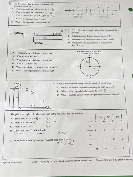 Position distance displacement worksheet answers. 2.2 Speed and Velocity - Physics | OpenStax Earlier, you have read that distance traveled can be different than the magnitude of displacement. In the same way, speed can be different than the magnitude of velocity. For example, you drive to a store and return home in half an hour. If your car’s odometer shows the total distance traveled was 6 km, then your average speed was 12 km/h. Vectors and Projectiles Review - with Answers - Physics Classroom (b) What is the resulting displacement of the hiker? Answer: Distance = 50.0 km; Displacement = 15.5 km, 74 degrees. Distance is a scalar quantity and does not regard the direction of the individual legs of the hike as being important. So the distance is simply the arithmetic sum of the distances of the three individual legs of the hike. 1D Kinematics Review - with Answers - Physics Classroom The diagram below depicts the path of a person walking to and fro from position A to B to C to D. The distance for this motion is 100 yds. For the same diagram below, the displacement is 50 yds. Answer: BDF. a. FALSE - Distance is the scalar and displacement is the vector. Know this one! b. TRUE - Displacement is the change in position of an ... Microsoft is building an Xbox mobile gaming store to take on … Oct 19, 2022 · Microsoft’s Activision Blizzard deal is key to the company’s mobile gaming efforts. Microsoft is quietly building a mobile Xbox store that will rely on Activision and King games.