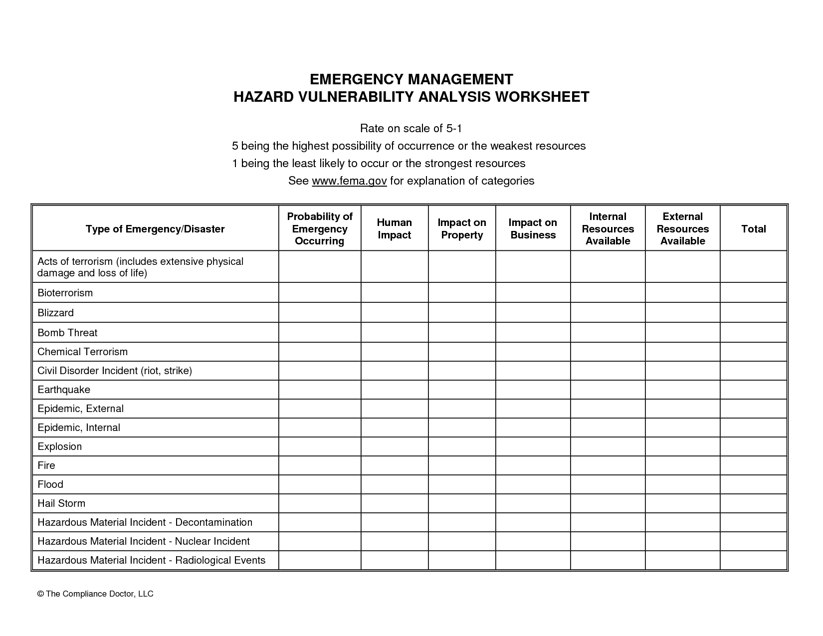 assignmentessays.comAssignment Essays - Best Custom Writing Services Get 24⁄7 customer support help when you place a homework help service order with us. We will guide you on how to place your essay help, proofreading and editing your draft – fixing the grammar, spelling, or formatting of your paper easily and cheaply. NIMS, Hazard and Vulnerability Analysis Worksheet for Emergency ... Prepare a Hazard and Vulnerability Analysis for the catastrophes or emergencies you've identified. Begin by identifying the disaster or calamity that you believe offers the greatest threat to your SLP subject. Complete the table below by identifying dangers as specified in the Module 2 Home page's Hazard Analysis section. Note: Hazard Magnitude PDF HAZARD VULNERABILITY ANALYSIS - Louisiana Department of Health HAZARD VULNERABILITY ANALYSIS . INSTRUCTIONS: Evaluate every potential event in each of the three categories of probability, risk, and preparedness. Add additional events as necessary. Issues to consider for probability include, but are not limited to: 1. Known risk 2. Historical data 3. Manufacturer/vendor statistics Hazard Vulnerability Analysis Tool | Florida Health Care Association Excel Tool - Hazard Vulnerability Analysis This tool meets the requirements for a facility-based risk assessment as required in the CMS Emergency Preparedness Rule. Developed by the Big Bend Health Care Coalition and the FHCA Emergency Preparedness Council, the tool is based on the Kaiser Permanente Hazard Vulnerability Analysis (HVA) widely used by healthcare facilities of all types across the nation.