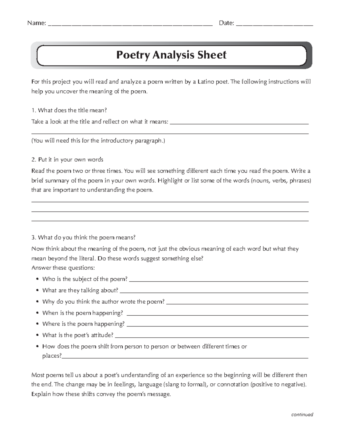 Poetry Analysis Worksheet Teaching Resources | Teachers Pay Teachers Poetry Analysis Worksheets, Printable and Digital by Julie Faulkner 5.0 (179) $6.49 PDF Google Apps™ These poetry analysis and comprehension worksheets in printable and digital format are an excellent modern and engaging activity to have students take ownership of their learning and dig deeper and closely read a poem.
