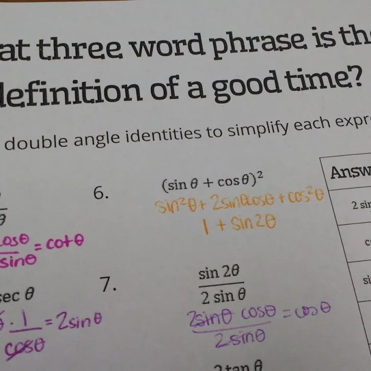 Double+Half Angle Identities - Kuta Software Worksheet by Kuta Software LLC ... Double- and Half-Angle Identities. Use a double-angle identity to find the exact value of each expression. 1) sin 120°. Double angle trigonometric Identity | SAT PREP Worksheet by Kuta Software LLC. SATPREP. Double angle trigonometric Identity. Name___________________________________. Date________________.