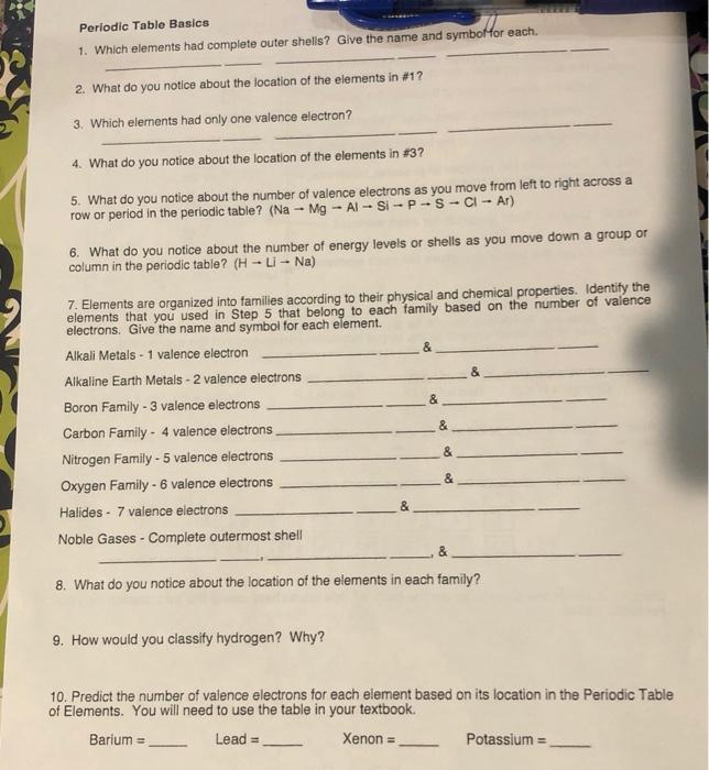Periodic Table Basics Answers & Questions Worksheet Periodic Table Basics 1. Which elements had complete outer shells? Give the name and symbol for each. Neon, Ne and Argon, AR What do you notice about the location of the elements in Question #2? The elements are located all to the last column on the right (column 18). 4. Which elements had only one valence electron?
