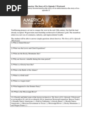 America the story of us westward worksheet. The History Channel America: The Story of US Episode #3-Westward Directions: Fill in the blanks below. This is a quick paced worksheet: questions will be answered fast throughout the video. America: the Story of Us “Westward” - Thompson School District America: the Story of Us. “Westward”. 1. In ______ the land in the west belonged to Britain, France, Spain and Native. American tribes. 2. In March 1775, ... America The Story Of Us: Westward Teaching Resources | TPT Results 1 - 24 of 654 ... Browse america the story of us: westward resources on Teachers Pay Teachers, a marketplace trusted by millions of teachers for original ... The Story of US Name____________________ The Story of US Name____________________. Episode #3-Westward Hour_________. Directions: Fill in the blanks below. This is a quick paced worksheet; ...