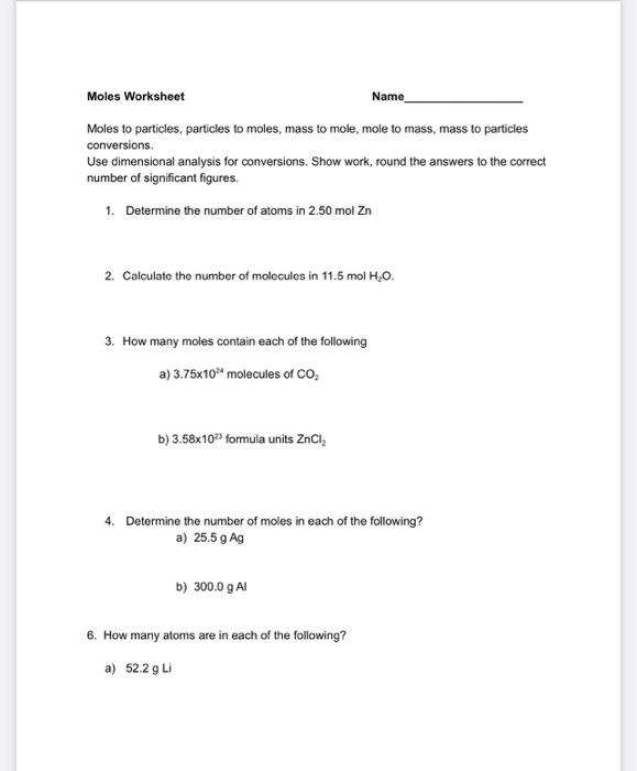 Moles, Mass and Particles Worksheet.docx - Name: _ Period:... Na3PO Part 2: Mole Conversions Work each of the following problems. SHOW ALL WORK. 1. How many atoms are in 6.2 moles of aluminum? 2. Convert 5.3 x 10 25 molecules of CO 2 to moles. 3. How many formula units of sodium acetate are in 0.87 moles of sodium acetate? 4. Convert 3.55 moles NaCl to formula units. 5. Convert 3.00 moles As 3 4 2S3 to grams.