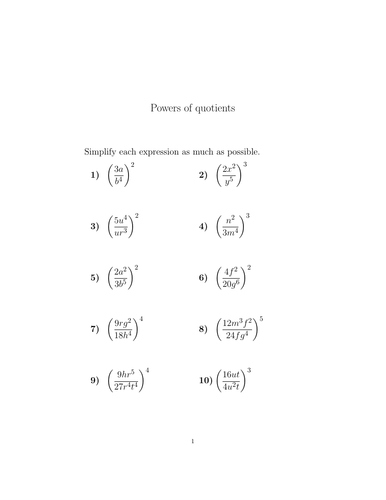 Powers of products and quotients worksheet