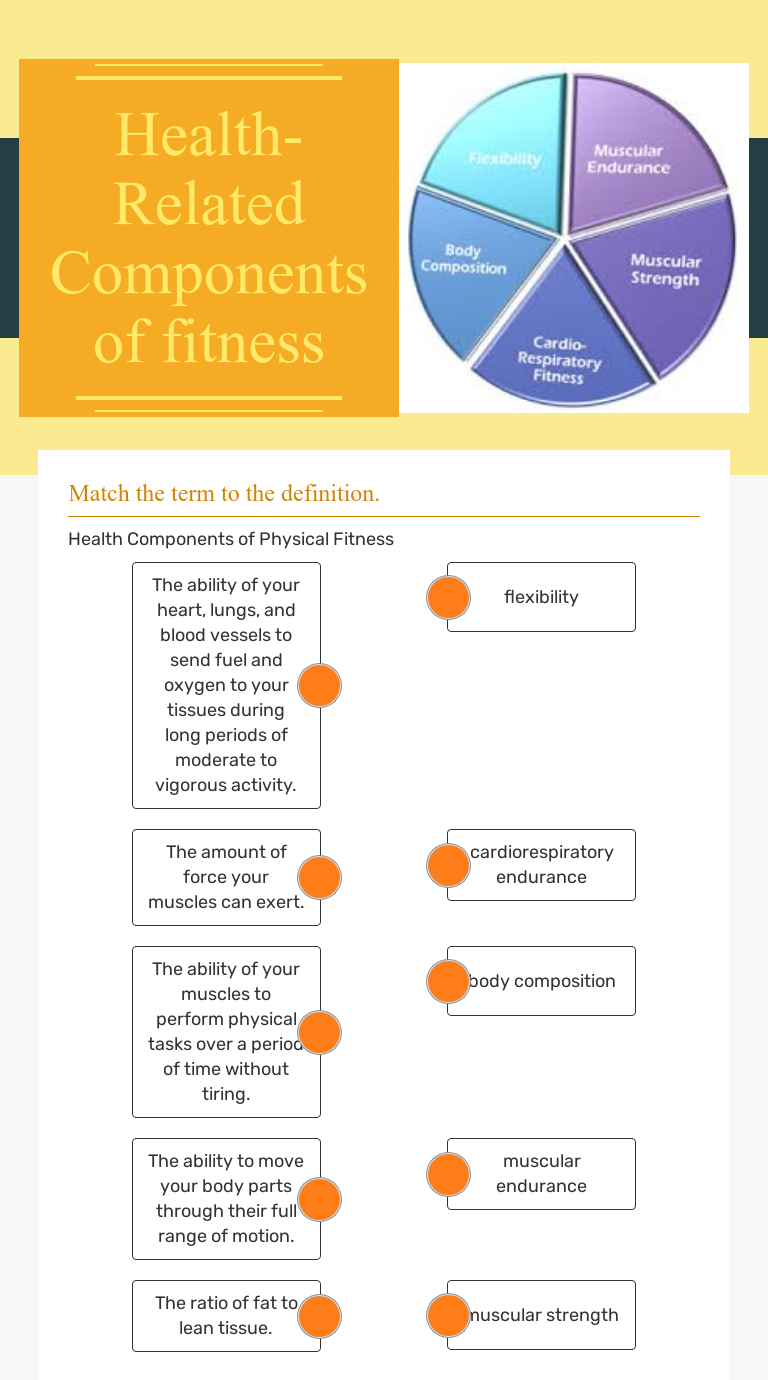 Fitness Components Worksheet Teaching Resources | TPT The Components of Fitness Display Banners have been uniquely developed as a valuable and attractive visual aid when implementing Health and Skill Fitness Components in your physical education classes. The 11 banners include the following fitness components: Health Related - 1. Cardiovascular Endurance, 2. Flexibility, 3. Muscular Strength, 4. Components of Fitness worksheet - Liveworksheets.com Five Components of Fitness online worksheet for Grade 7. You can do the exercises online or download the worksheet as pdf.