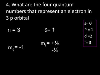 DOC QUANTUM NUMBERS WORKSHEET - Loudoun County Public Schools QUANTUM NUMBERS WORKSHEET 1. State the four quantum numbers, then explain the possible values they may have and what they actually represent. 2. State the number of possible electrons described by the following quantum numbers a. n = 3, l = 0 b. n = 3, l = 1 c. n = 3, l = 2, ml = -1 d. n = 5, l = 0, ml -2, ms -1/2 3.