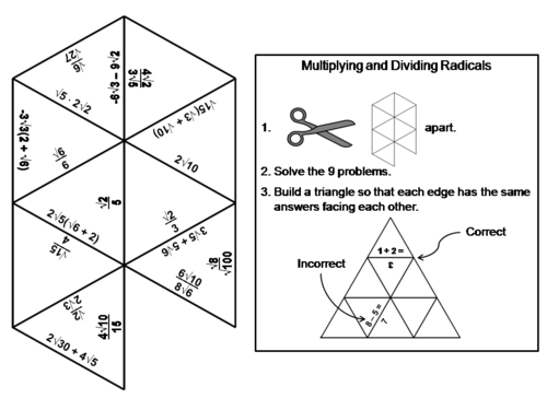 Multiplying radicals calculator - softmath Multiplying fractions worksheet, math tutoring software, Free Online Sats Papers, program to find slope calculator, free answers to algebra 2, graphs of common functions. Fluid mechanics ppt, free printable maths worksheets- year 7+, free third grade worksheets on inches, feet, and yards, hyperbola sample problems, free worksheets on math ... Free Printable Math Worksheets for Pre-Algebra - Kuta Software One-step inequalities by multiplying or dividing; Two-step inequalities ; Multi-step inequalities; Exponents and Radicals. Multiplication property of exponents; Division property of exponents; Powers of products and quotients; Writing scientific notation; Square roots; Proportions and Percents. Converting between percents, fractions, and decimals; Percent problems, … Free Math Worksheets (pdfs) with answer keys on Algebra I, … Law of Sines and Cosines Worksheets Law of Sines and Cosines Worksheet (This sheet is a summative worksheet that focuses on deciding when to use the law of sines or cosines as well as on using both formulas to solve for a single triangle's side or angle) ; Law of Sines; Ambiguous Case of the Law of Sines; Law of Cosines