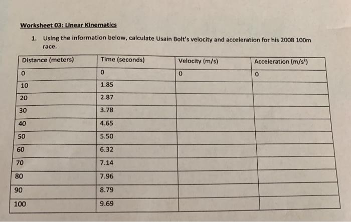Velocity and acceleration calculation worksheet