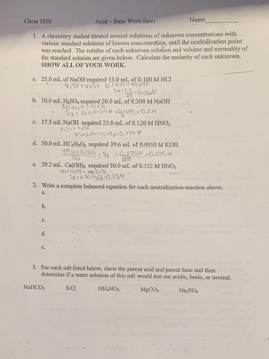 Acid Base Titration Worksheet-calculations including molar ... - StuDocu Acid Base Titration Worksheet-calculations including molar concentration and neutralization point acid-base titration worksheet with calculations. Acid Base Titration Worksheet-c... View more School High School - USA Degree Advanced Placement (AP) Course AP Chemistry (AP Science)