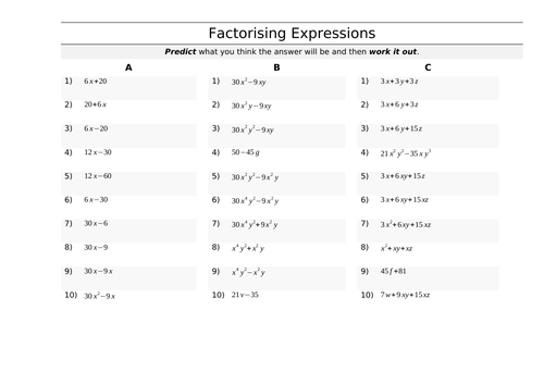 Factoring linear expressions worksheet. › worksheets › grade3Multiplication worksheets for grade 3 - Homeschool Math Below you will find the various worksheet types both in html and PDF format. They are randomly generated so unique each time. The answer key is automatically included on the second page. To get a different worksheet using the same options, press 'refresh' in the browser window (only when viewed in browser). › verbal-expressionsVerbal expressions - Math Worksheet Factoring By grouping Common factor only Special cases Linear Equations and Inequalities Plotting points Slope Graphing absolute value equations Percents Percent of change Markup, discount, and tax Polynomials Adding and subtracting Dividing Multiplying Naming Quadratic Functions Completing the square by finding the constant Graphing study.com › academy › practiceQuiz & Worksheet - Simplifying Expressions with Exponents ... About This Quiz & Worksheet. Test your ability to simplify expressions using exponents in this quiz/worksheet combo. You will have five practice problems to solve, and you will need to know how to ... gizmos.explorelearning.com › find-gizmos › launch-gizmoEl Gizmos - ExploreLearning Find Your Solution. Start playing, exploring and learning today with a free account. Or contact us for a quote or demo. Sign Up For Free Get a Quote
