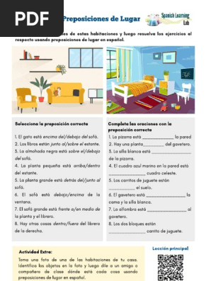 The House and Prepositions of Place - Spanish Worksheet PDF The House and Prepositions of Place - Spanish Worksheet PDF Hello! This worksheet will help you practice the vocabulary for the house as well the structure of the sentences using the verb "ESTAR" (to be) plus prepositions of place in Spanish. Part of the worksheet also focuses the vocabulary for house objects in the living room and bedrooms.
